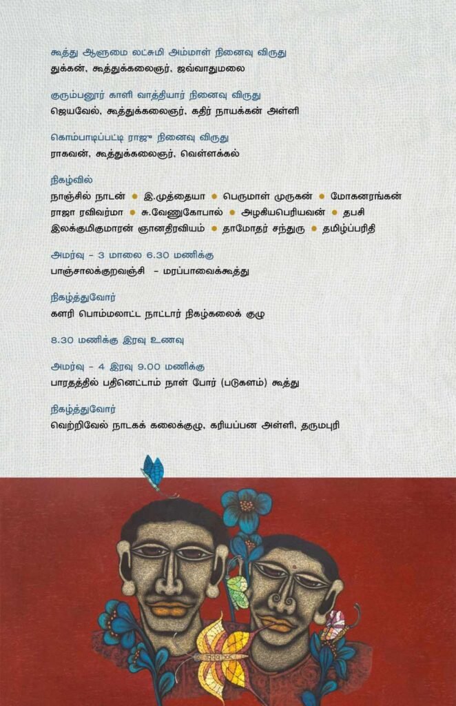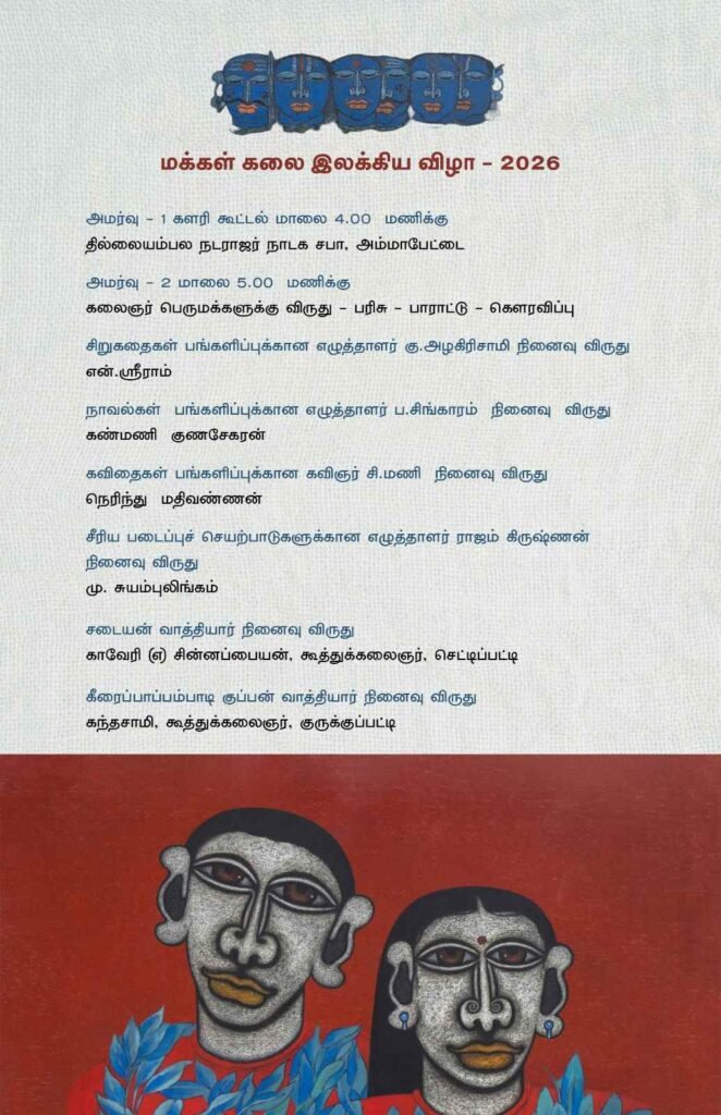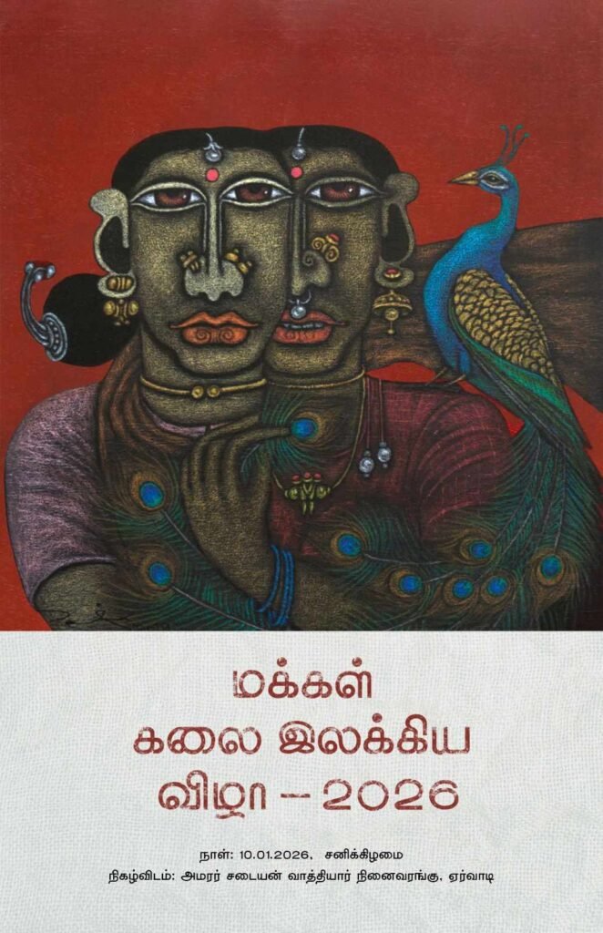 அவ்வண்ணமே எதிர் வரும் 10- 01- 2026 சனிக்கிழமை அன்று சேலம் மாவட்டம் மேட்டூர் வட்டம் ஏர்வாடியில் களரி நிகழ்த்தவிருக்கும் மக்கள் கலை இலக்கிய விழாவிற்கு நேரில் வந்து சிறப்பிக்க வேண்டுமாய்ப் பணிவன்புடன் கேட்டுக்கொள்கிறேன்.